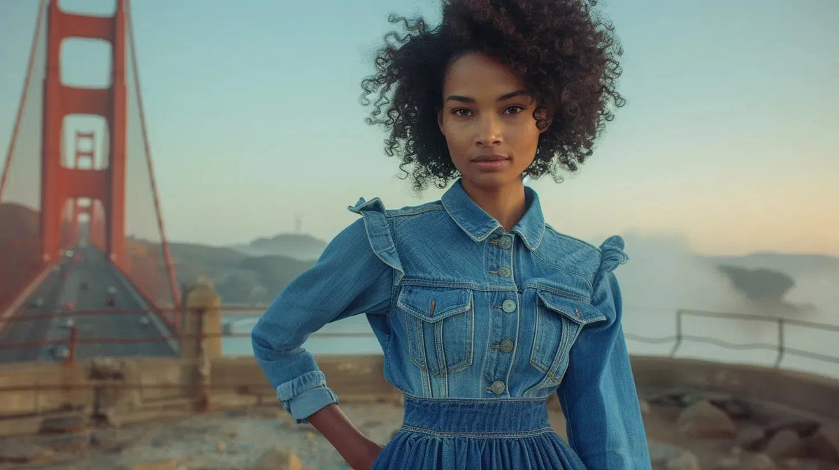 Chic woman in denim skirt at Golden Gate Bridge, highlighting style and locale. Spring season.