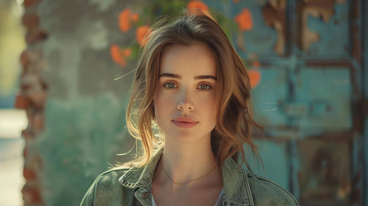 Eco-chic woman in tailored green denim jacket with brass buttons, outdoor urban backdrop. Spring season.